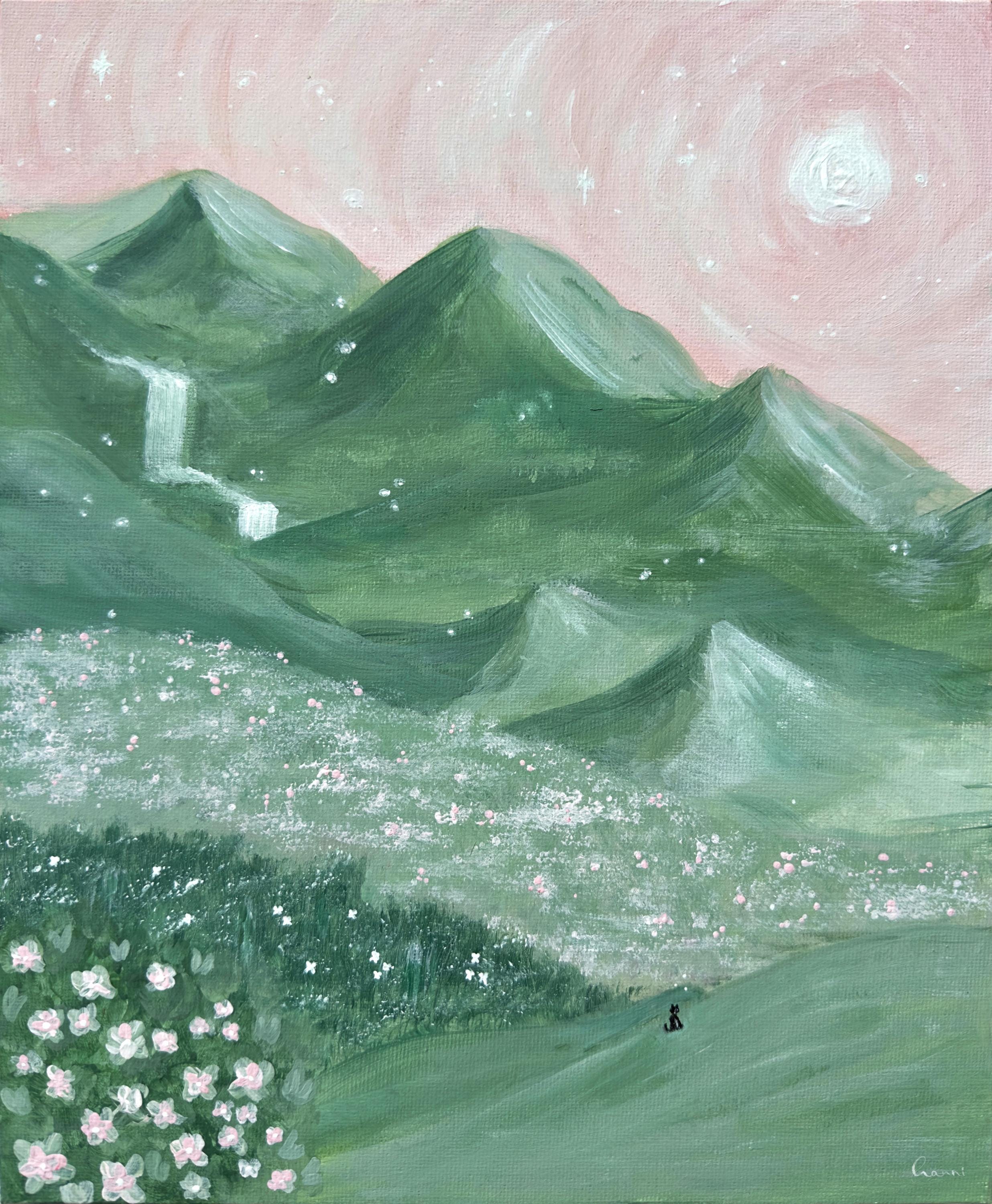 Escape into a calm, dreamy world with this Ghibli-inspired digital wallpaper, featuring rolling green mountains, soft pink skies, blooming wildflowers, and a tiny black cat quietly sitting in the meadow. This hand-painted acrylic artwork captures a peaceful, whimsical atmosphere inspired by Studio Ghibli landscapes, perfect for cozy, calming digital spaces.